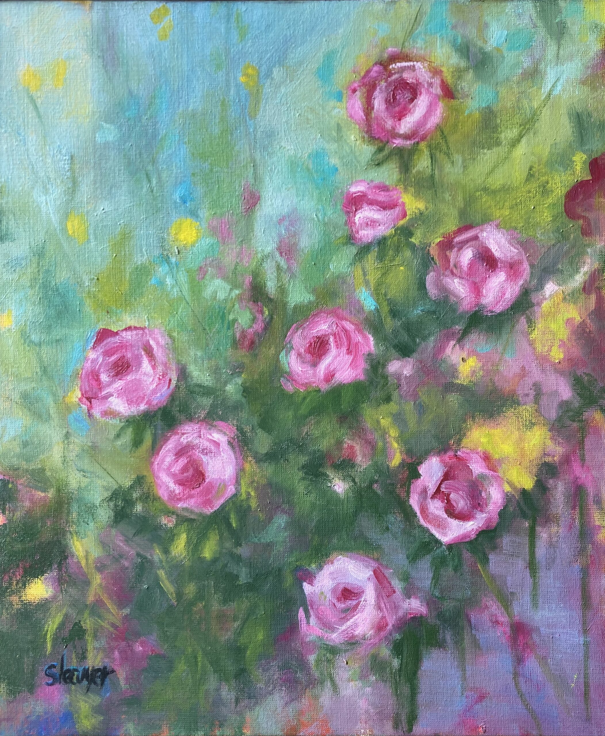 Cette peinture de roses romantiques au jardin fait partie d’une série sur les roses que j’ai commencée au printemps 2025.